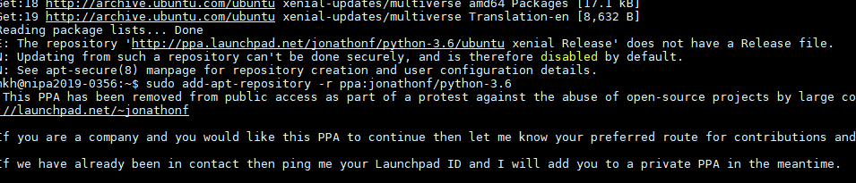 sudo add-apt-repository ppa:jonathonf/python-3.6 (오류)